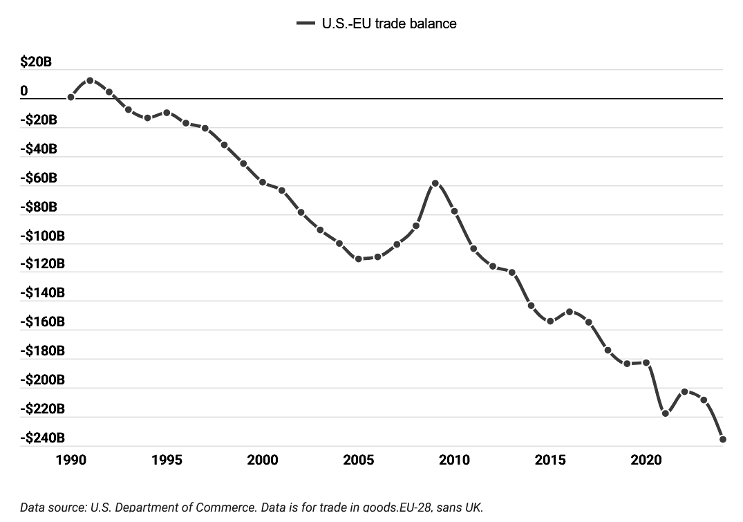 Gli Stati Uniti avevano nei suoi confronti un deficit simile a quello registrato con la Cina: 236 miliardi di dollari; si capisce perché Trump abbia giustificato (il 26/2/2025) i dazi doganali previsti contro l’Unione Europea con il fatto che quest’ultima sarebbe stata costituita per “fregare” (screw) gli Stati Uniti, e perché abbia mostrato una relativa clemenza nei confronti del Regno Unito...