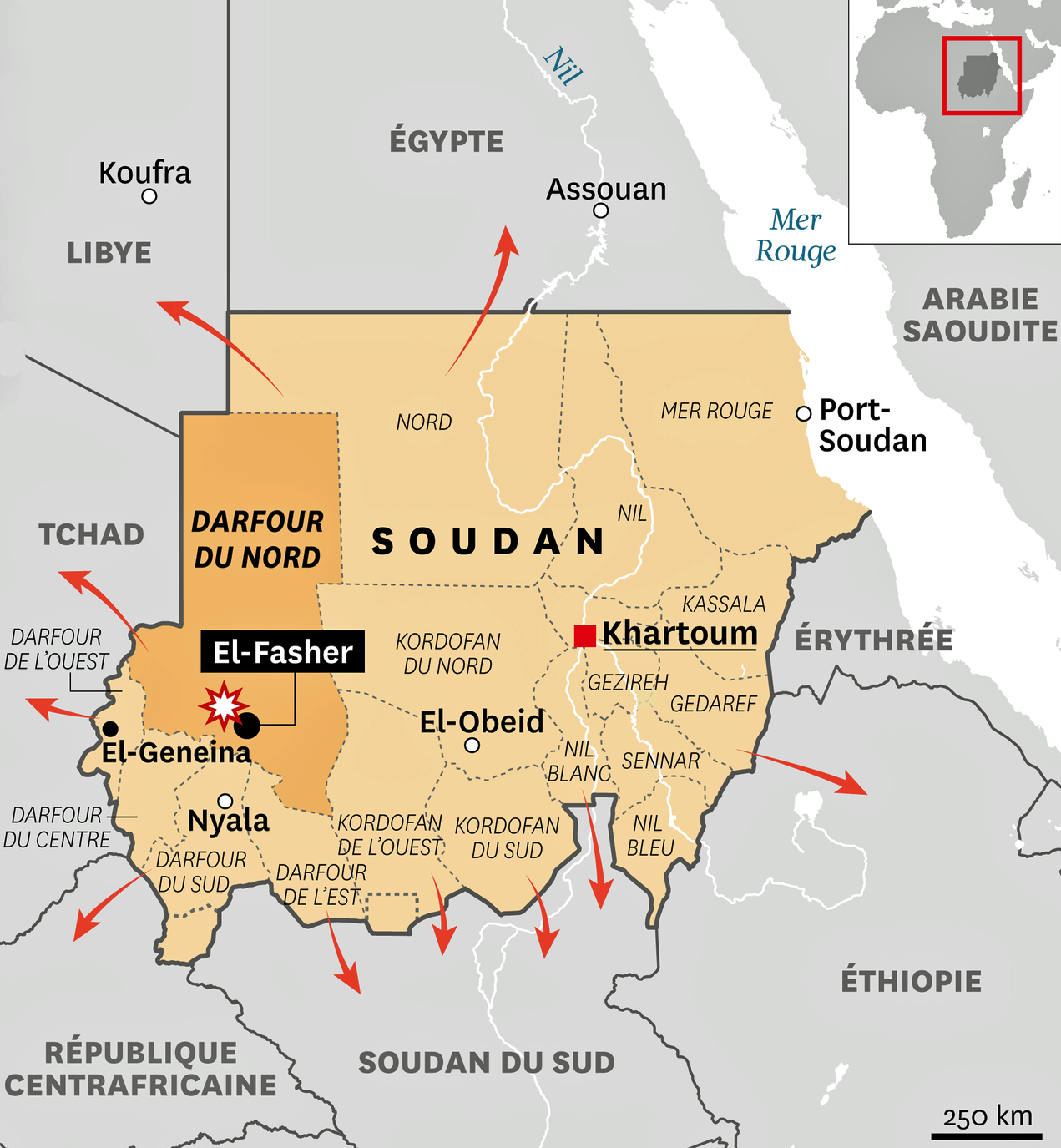 La conquista, el 26 de octubre, de la gran ciudad de El-Fasher, en Darfur, por parte de las RSF («Fuerzas de Apoyo Rápido» del general Mohamed Hamdan Dogolo, conocido como Hemetti), tras dos años de asedio, fue seguida de la masacre de miles de civiles (especialmente en los hospitales). Sus adversarios, las Fuerzas Armadas Sudanesas (SAF), también han sido acusados de limpieza étnica, masacres de civiles y violaciones en Darfur y otras provincias.