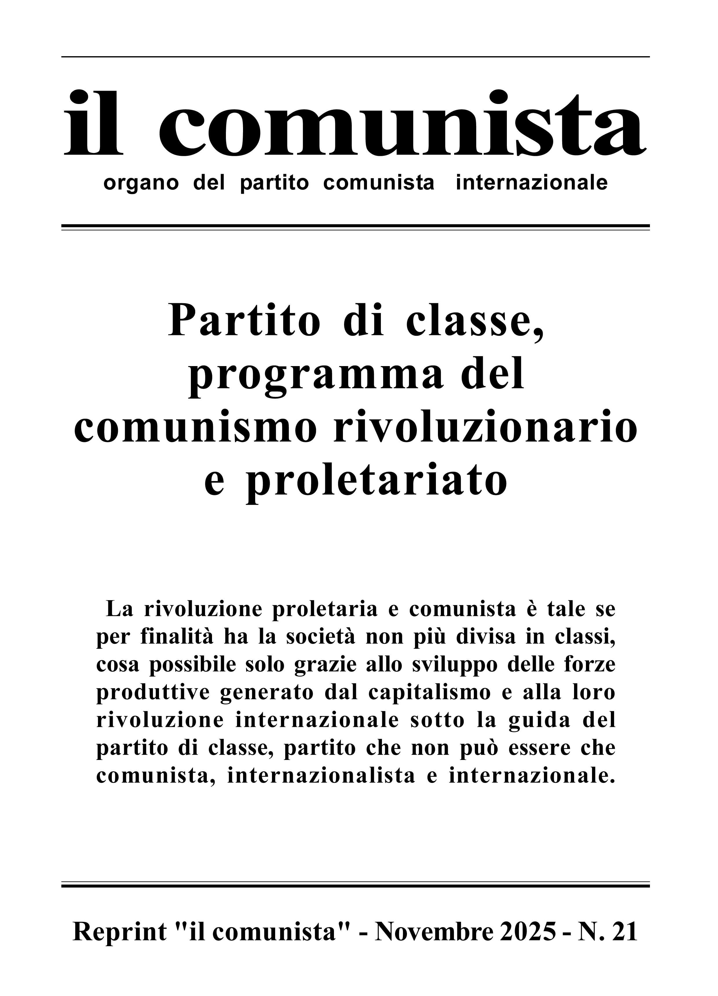 Gli articoli contenuti in questo Reprint fanno parte di uno svolgimento col quale mettevamo in chiaro alcuni concetti marxisti fondamentali riguardo la lotta di classe, la lotta del proletariato per la sua emancipazione dal capitalismo, il proletariato come classe storicamente internazionale, il partito di classe – cioè il partito comunista rivoluzionario – il rapporto del partito di classe col proletariato, con la sua rivoluzione, con la sua dittatura di classe e con la trasformazione della società capitalistica in società socialista e, infine, comunista.
