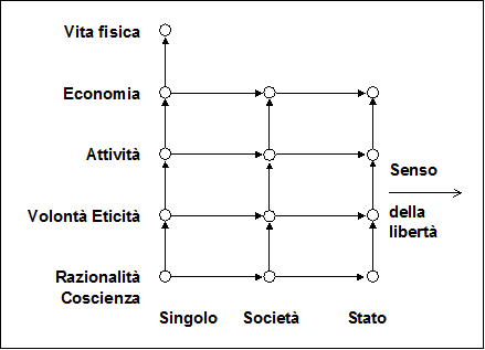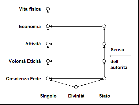 Per gli schemi trascendentalista e demoliberale, pur andando nell'uno il senso dell'autorità dello Stato verso il singolo, mentre nell'altro il senso della libertà va dal singolo alla società e allo Stato, per entrambi è l'idea (nell'uno promanante dalla divinità, nell'altro diffusa in tutti i singoli componenti la collettività umana) che condiziona e determina le azioni umane. In entrambi si va logicamente dalla coscienza (intesa nel primo come fede, nel secondo come razionalità) alla volontà (per entrambi intesa come eticità), all'attività, all' economia e alla vita fisica.
