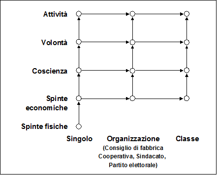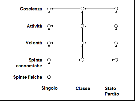 Lo scopo di questo schema è soltanto di semplificare i concetti del determinismo economico. Nel singolo individuo (e quindi anche nel singolo proletario) non è la coscienza teorica a determinare la volontà di agire sull'ambiente esterno, ma avviene l'opposto, come mostra lo schema con frecce dirette dal basso verso l'alto: la spinta del bisogno fisico determina, attraverso l'interesse economico, un'azione non cosciente, e solo molto dopo l'azione ne avviene la critica e la teoria per intervento di altri fattori.