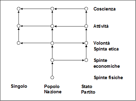Per gli schemi volontaristico-immediatista, staliniano e fascista le spinte fisiche ed economiche sono alla base della loro costruzione; e in questo carattere comune si contrappongono ai due precedenti schemi idealistici. Ma hanno in comune con essi la precedenza e preminenza che la volontà ha sull'attività per quanto riguarda il singolo e la classe (per il fascismo il popolo o la nazione). Altro carattere comune a questi tre schemi volontaristici (quello condiviso da Proudhon, Sorel, Bernstein, Gramsci ecc. anche individualistico; e in ciò è deteriore rispetto agli altri due): la successione parallela di spinte economiche, volontà, attività e coscienza che si riscontra tra il Partito e lo Stato (l'organizzazione immediata), da una parte, e il singolo e la classe (il popolo o la nazione per il fascismo), dall'altra, che comporta l'impossibilità per il Partito di una teoria scientifica dei fenomeni sociali.