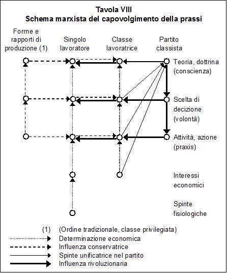 Solo nello schema marxista la successione di attività volontà e coscienza del singolo e della classe si trova completamente rovesciata nel Partito, la cui conoscenza dei fatti sociali investe passato presente e futuro, elevandosi al livello di teoria scientifica, con possibilità quindi di esercitare una volontà e un'azione, come è mostrato nell'ultima Tavola VIII - Schema marxista del capovolgimento della prassi.